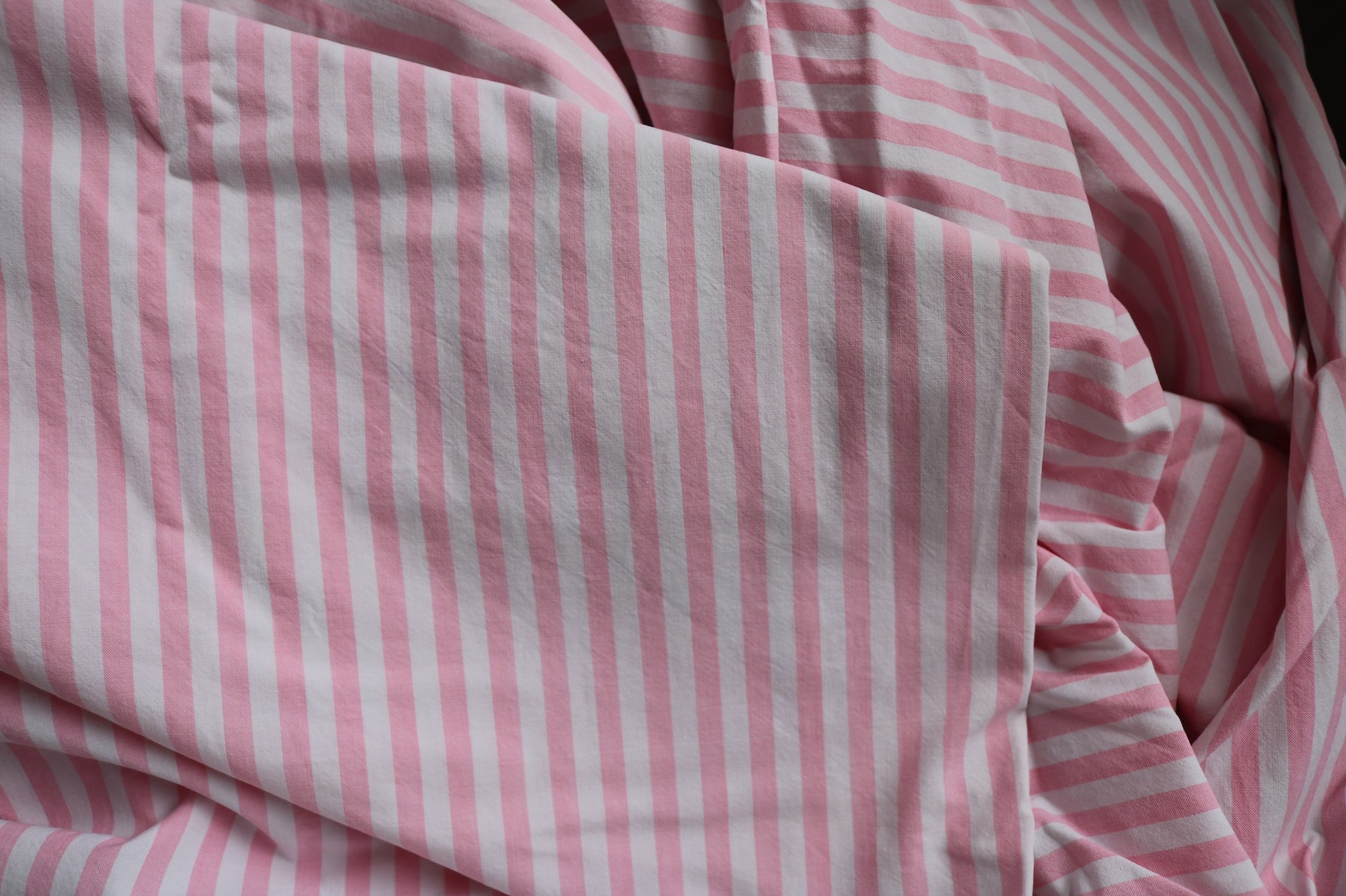 Note sur le tissu : Il s’agit de tissu de seconde main, ici des draps chinés, lavés et repassés avec soin. Certains défauts peuvent toutefois être présents. Dans ce cas, nous avons pris soin de les signaler directement sur le tissu et de prévoir une quantité légèrement supérieure afin que vous puissiez couper vos pièces sans problème.