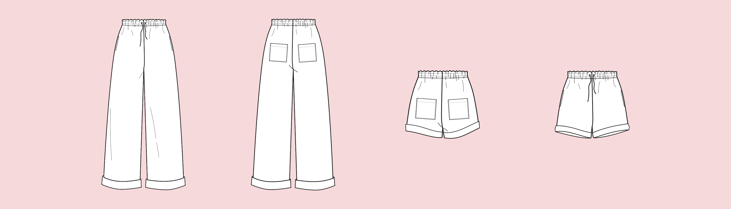 Clau est un pantalon ou un short à taille haute élastiquée et à la coupe large. Il possède des poches plaquées dans le dos et des poches incrustées sur les côtés. Il est possible de réaliser un ourlet simple ou un ourlet à revers. C'est un indispensable de la garde robe qui en fonction du choix de tissu peut faire un bon classique ou une pièce originale.