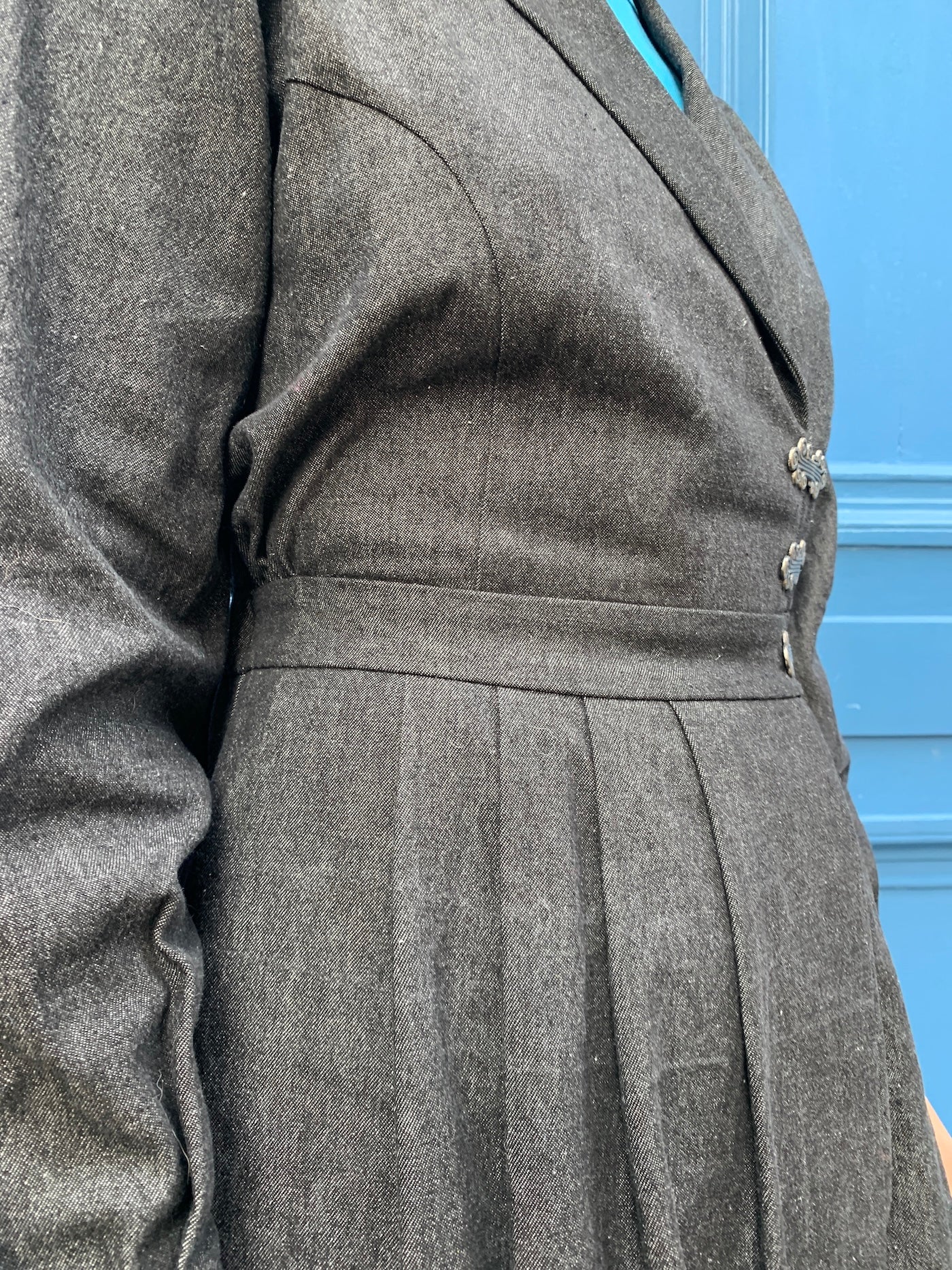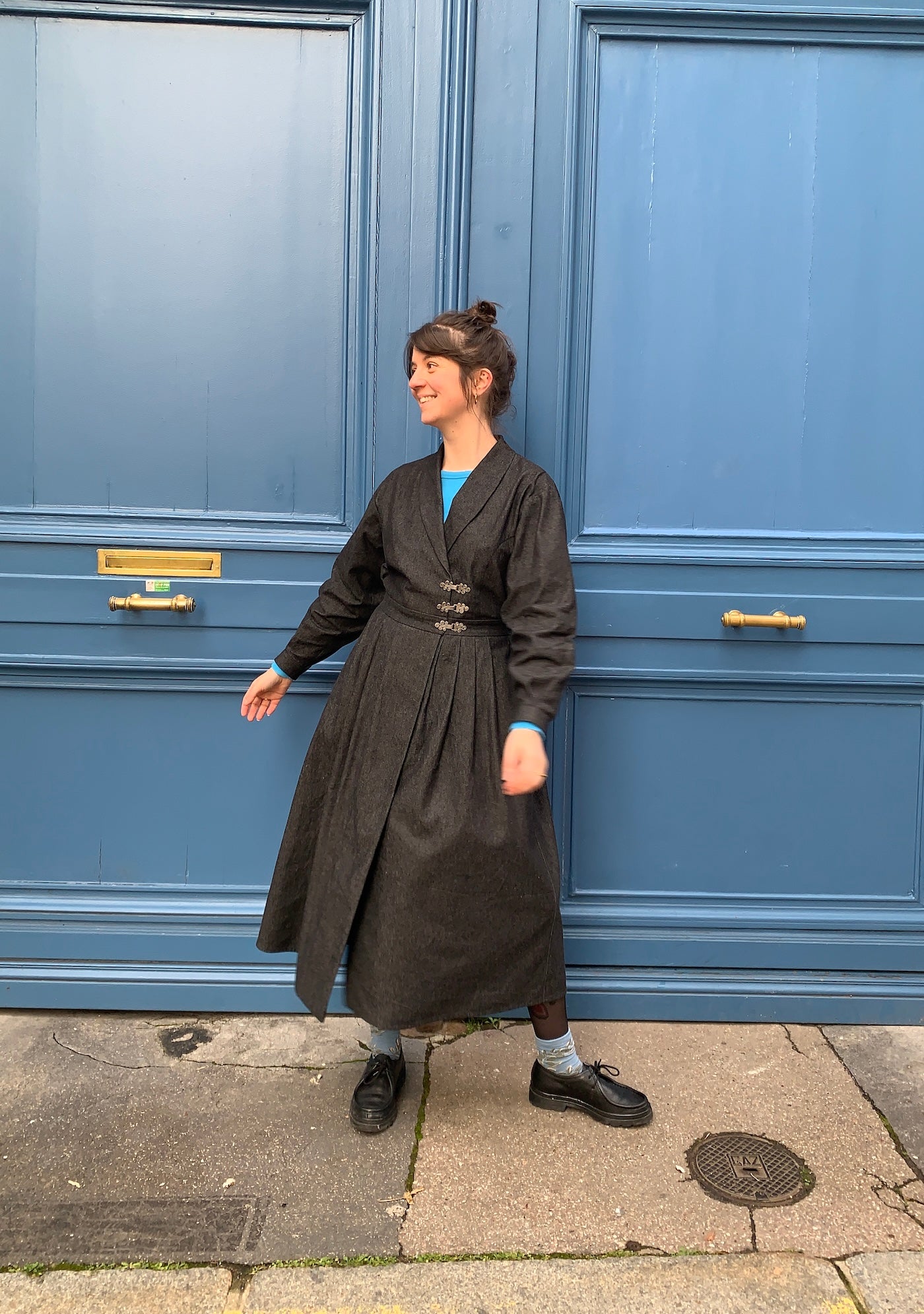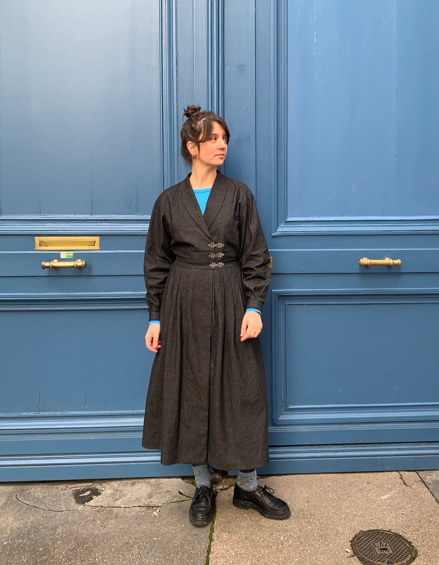 La jupe longue combine plis sur le devant et fronces au dos pour un volume bien réparti, et cache des poches discrètes dans les coutures. Le boutonnage, visible par paires sur le buste, devient invisible à partir de la jupe. Des fermoirs à crochet peuvent être utilisés pour les attaches du buste.