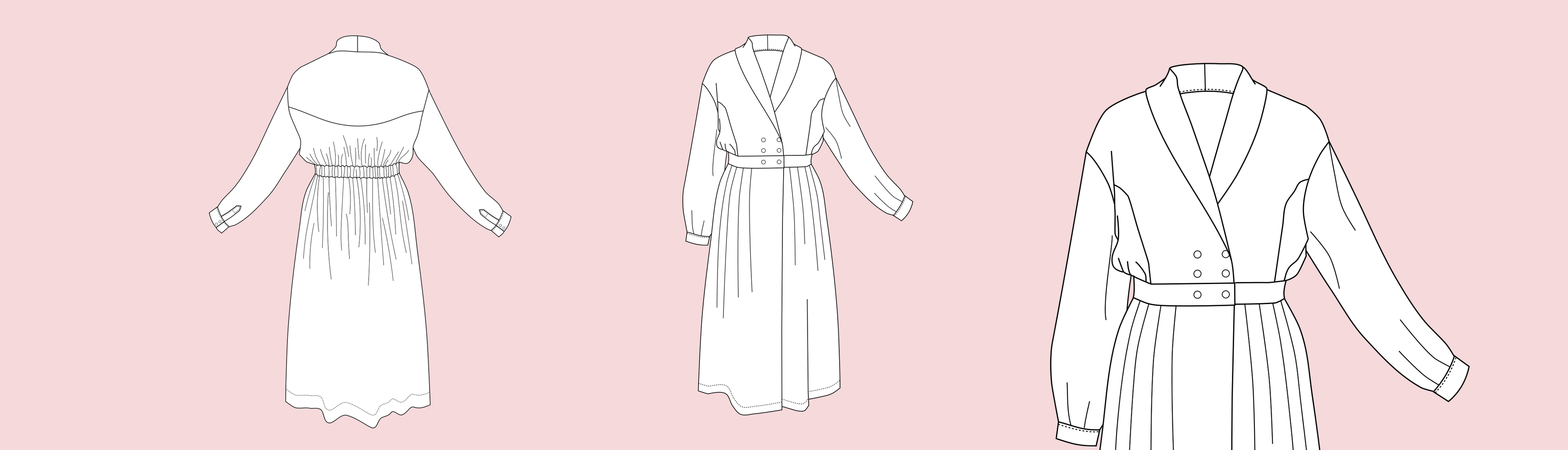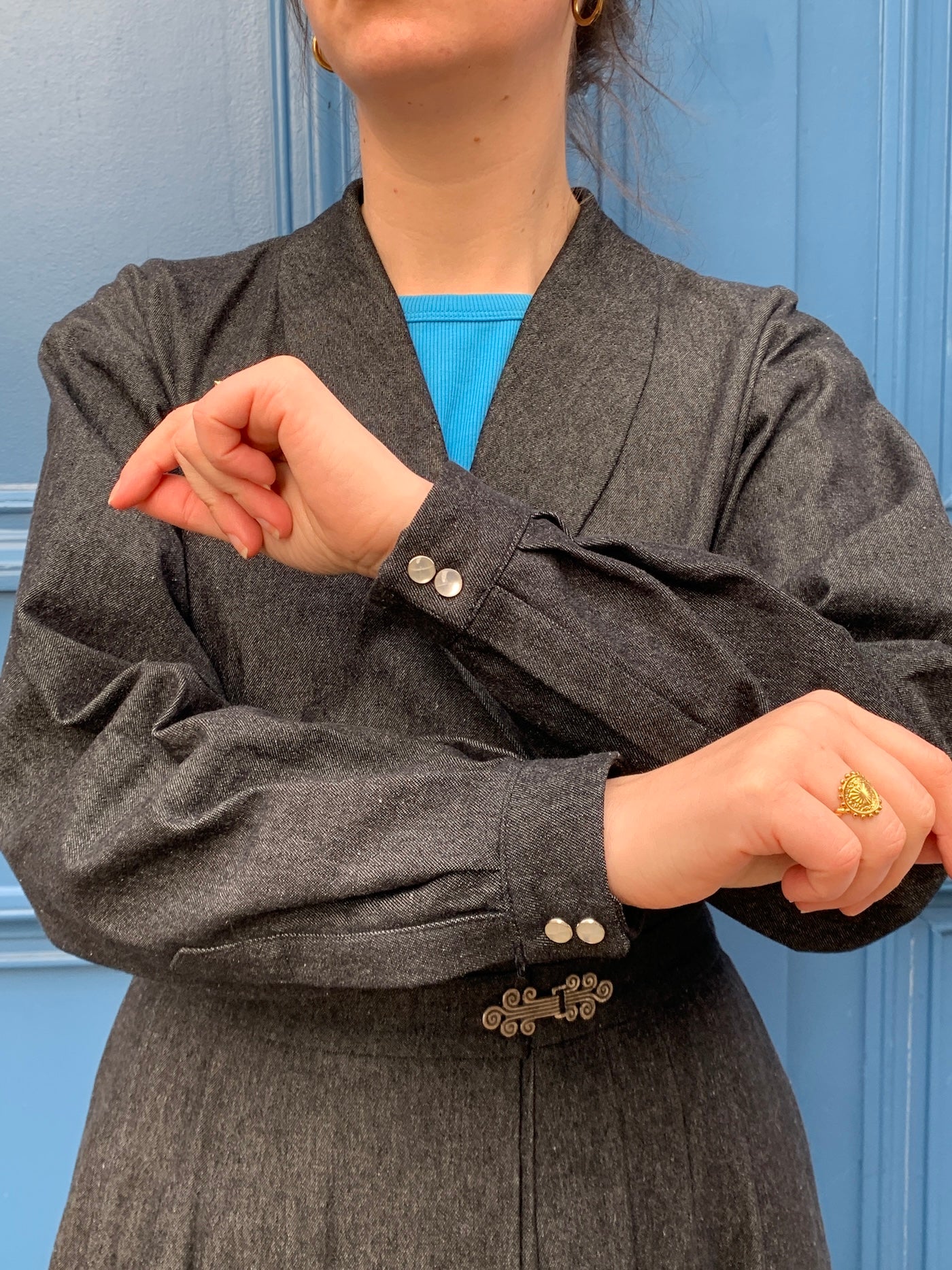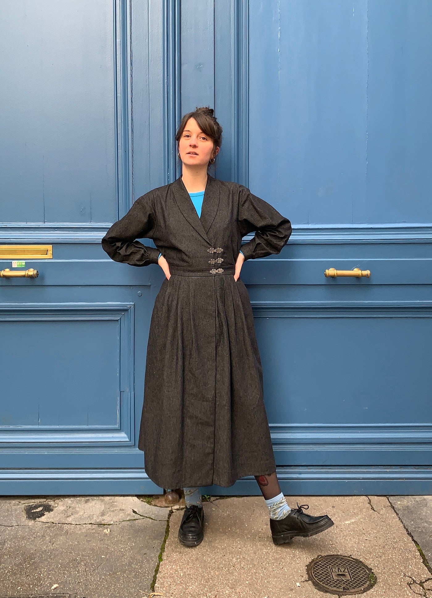 La jupe longue combine plis sur le devant et fronces au dos pour un volume bien réparti, et cache des poches discrètes dans les coutures. Le boutonnage, visible par paires sur le buste, devient invisible à partir de la jupe. Des fermoirs à crochet peuvent être utilisés pour les attaches du buste.