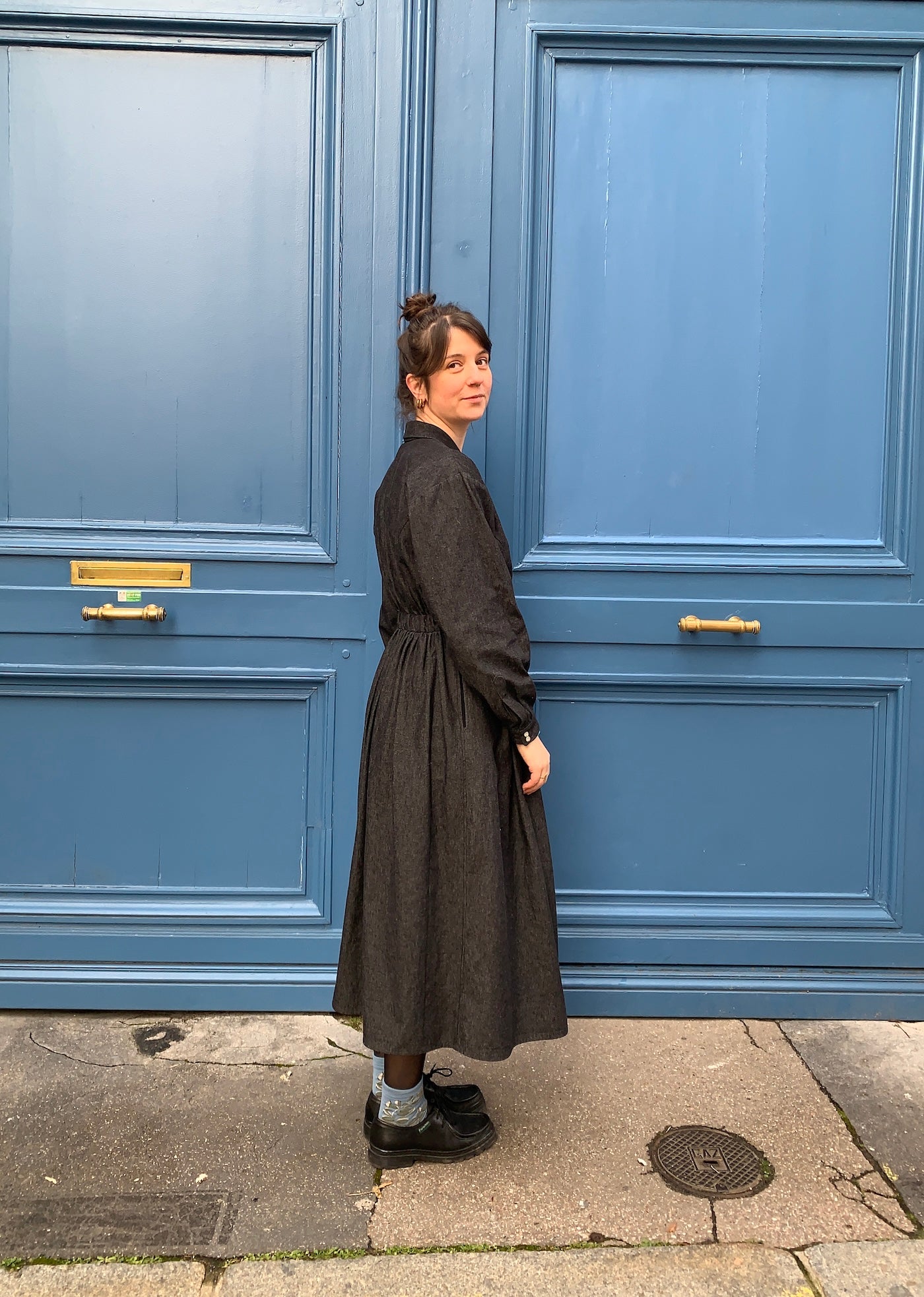 Suno est une robe longue à la taille marquée, d’inspiration vintage, années 50–60, pensée pour offrir une silhouette structurée tout en restant confortable. Sa coupe reste volontairement ample : la taille est soulignée sans être contraignante, pour un porté agréable et jamais près du corps.