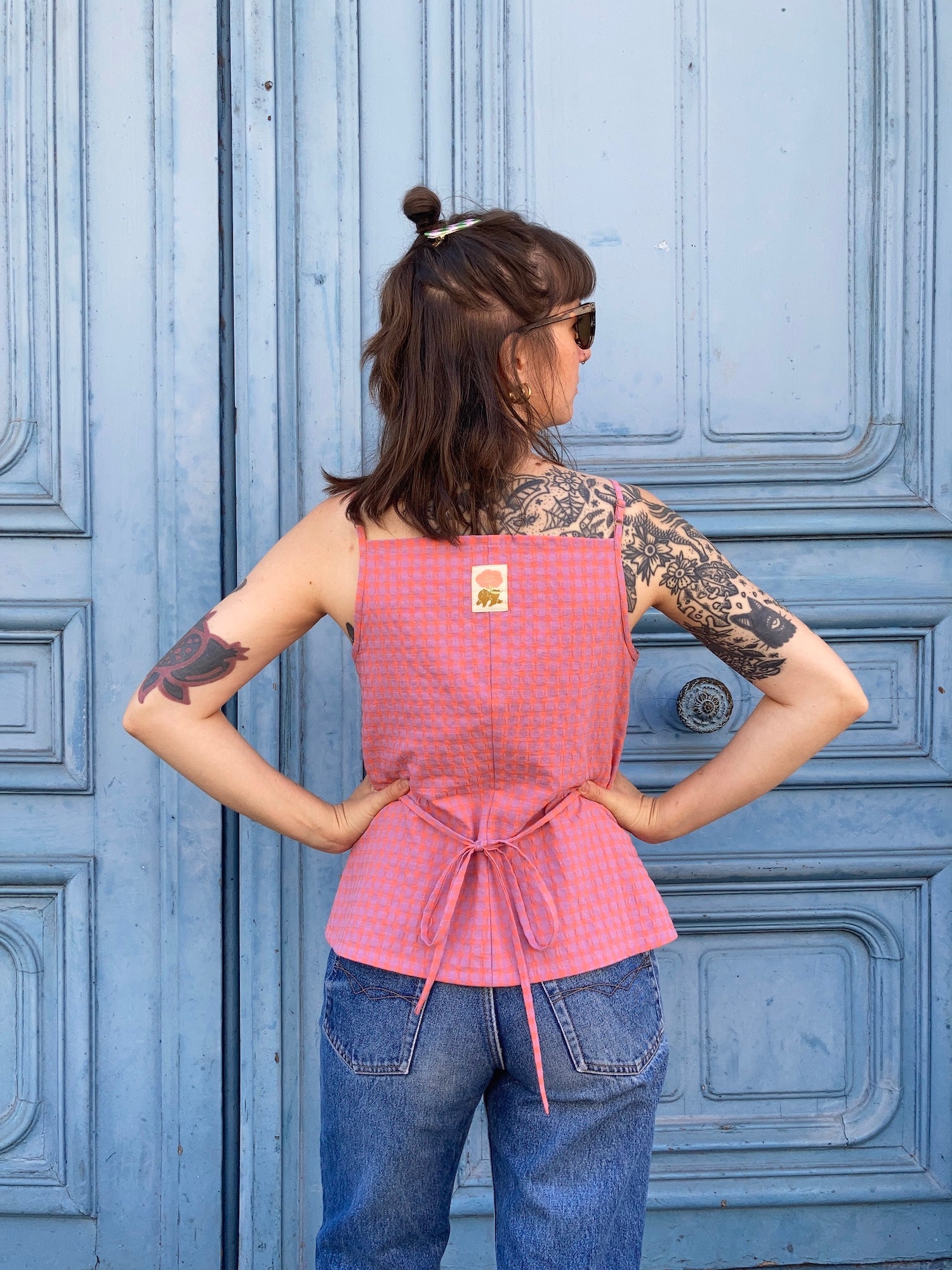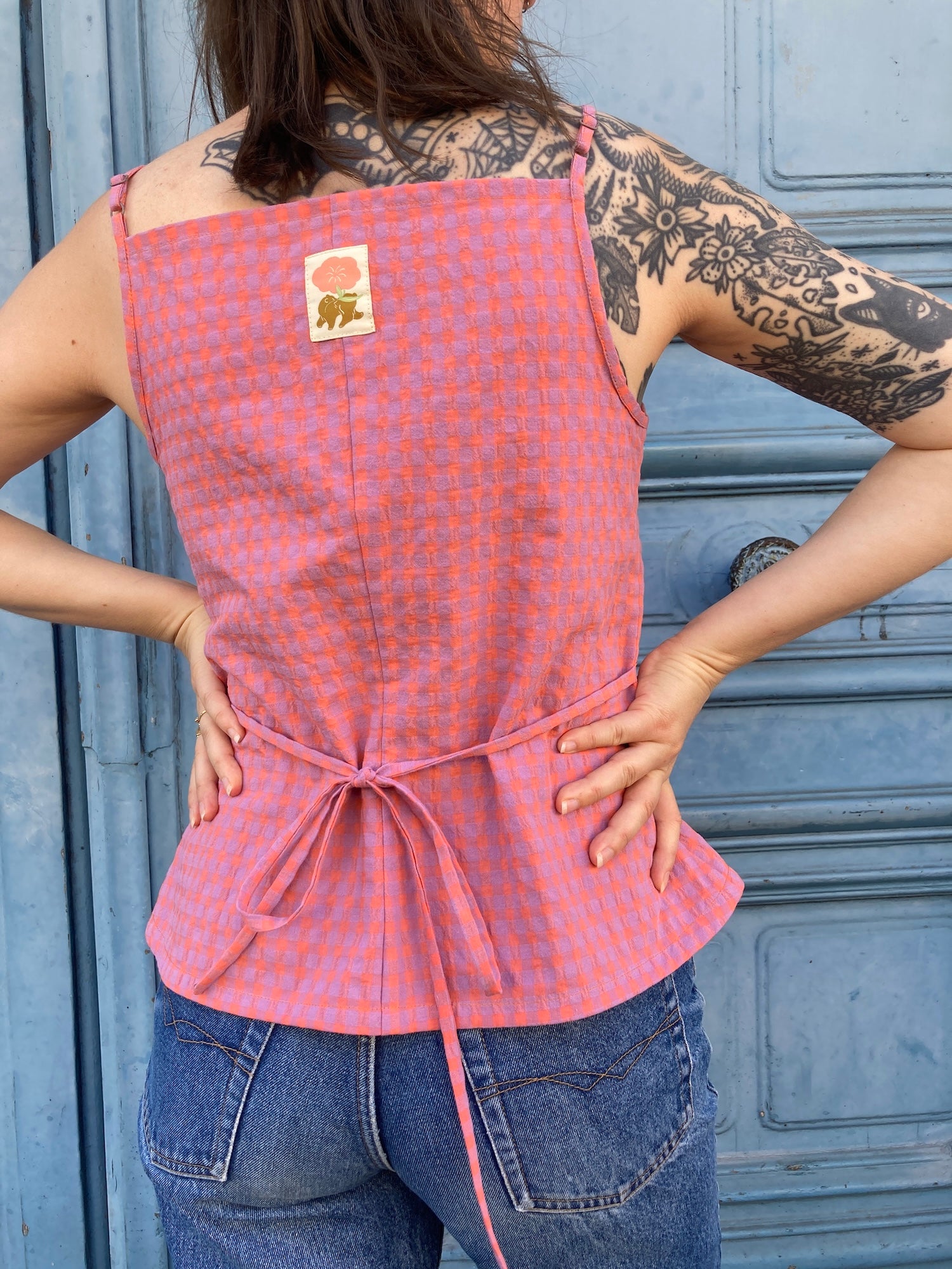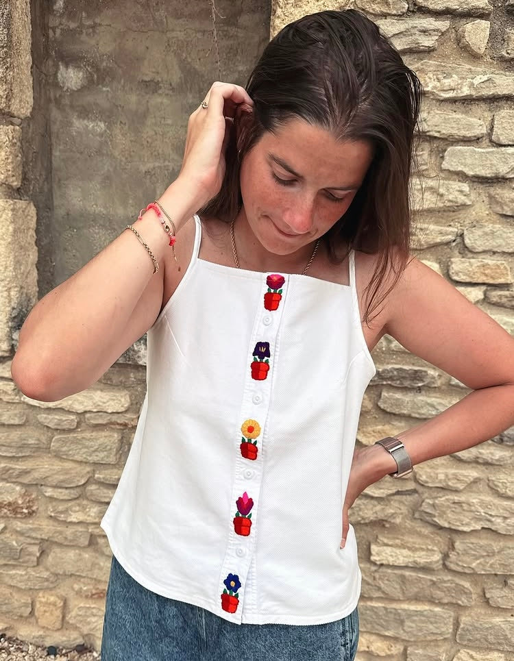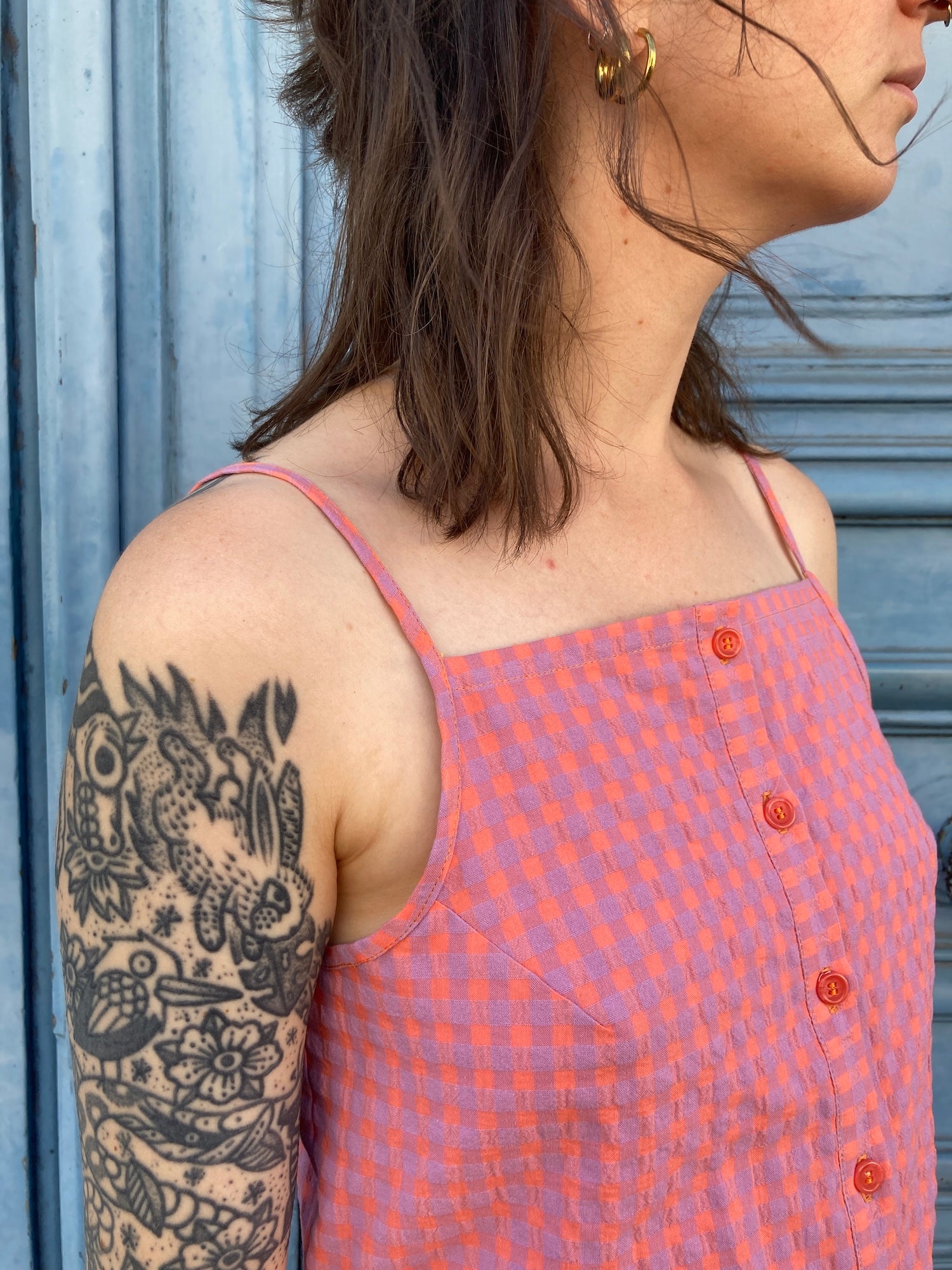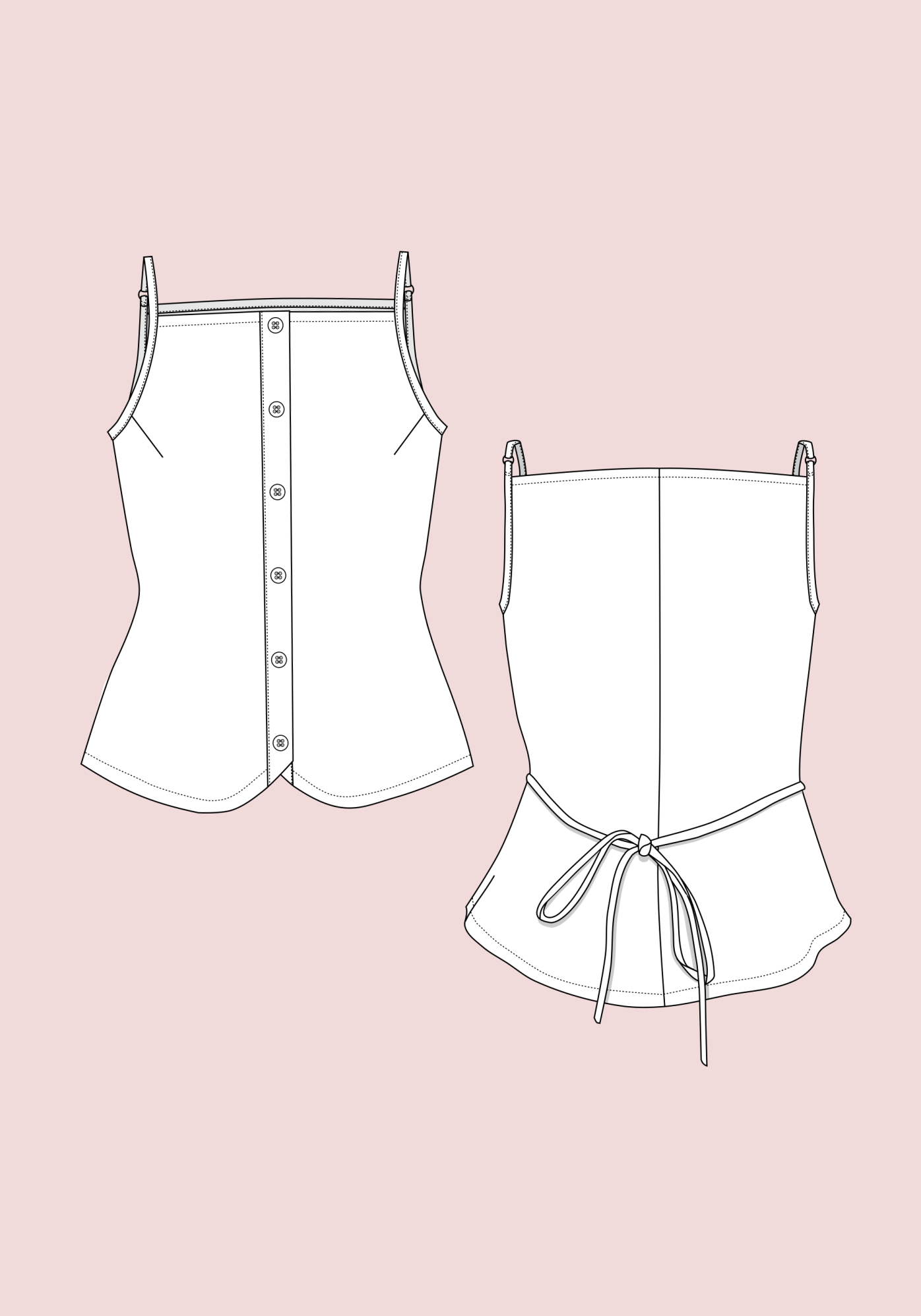 Oni est un débardeur à fines bretelles réglables, deux largeurs proposées, et à encolure droite, sur le devant et le dos. Il s’ouvre sur le devant par une boutonnière et présente un bas légèrement arrondi. Des pinces viennent souligner la poitrine. La taille est mise en valeur par des découpes et par des liens insérés dans les coutures côtés, à nouer dans le dos.