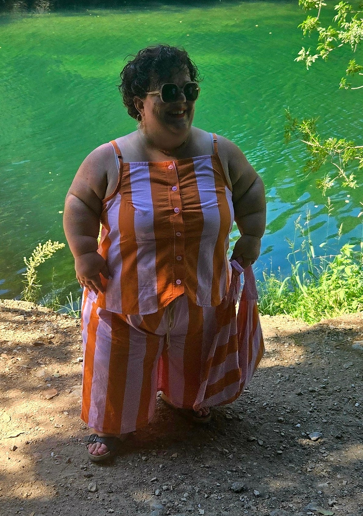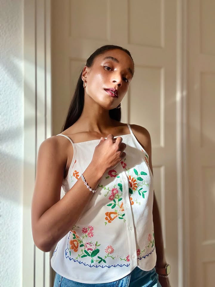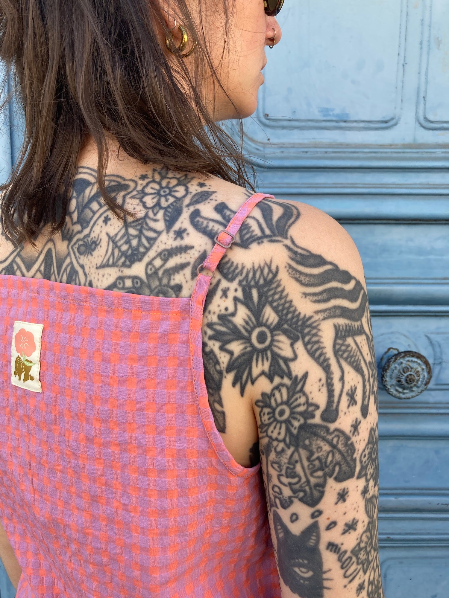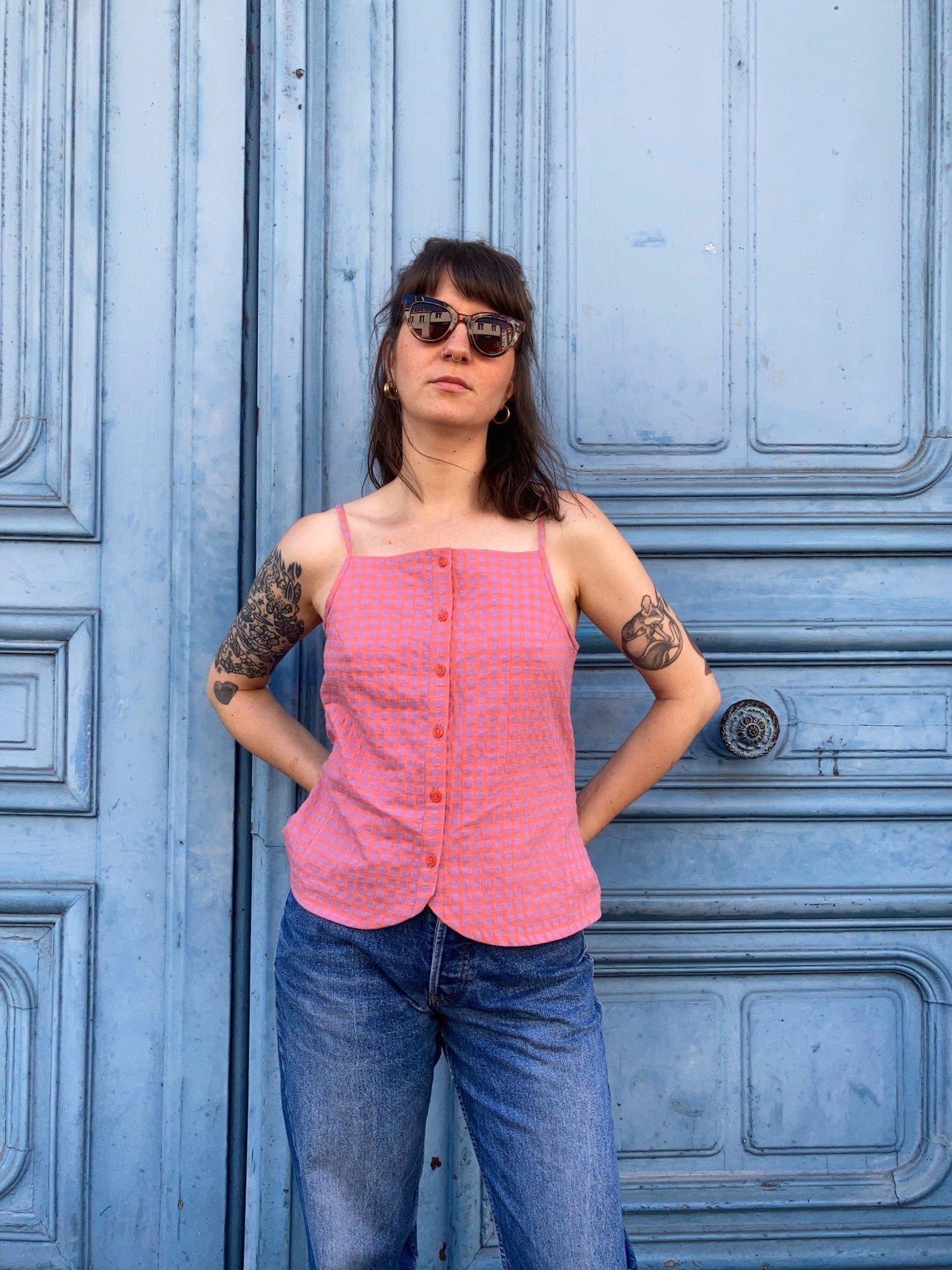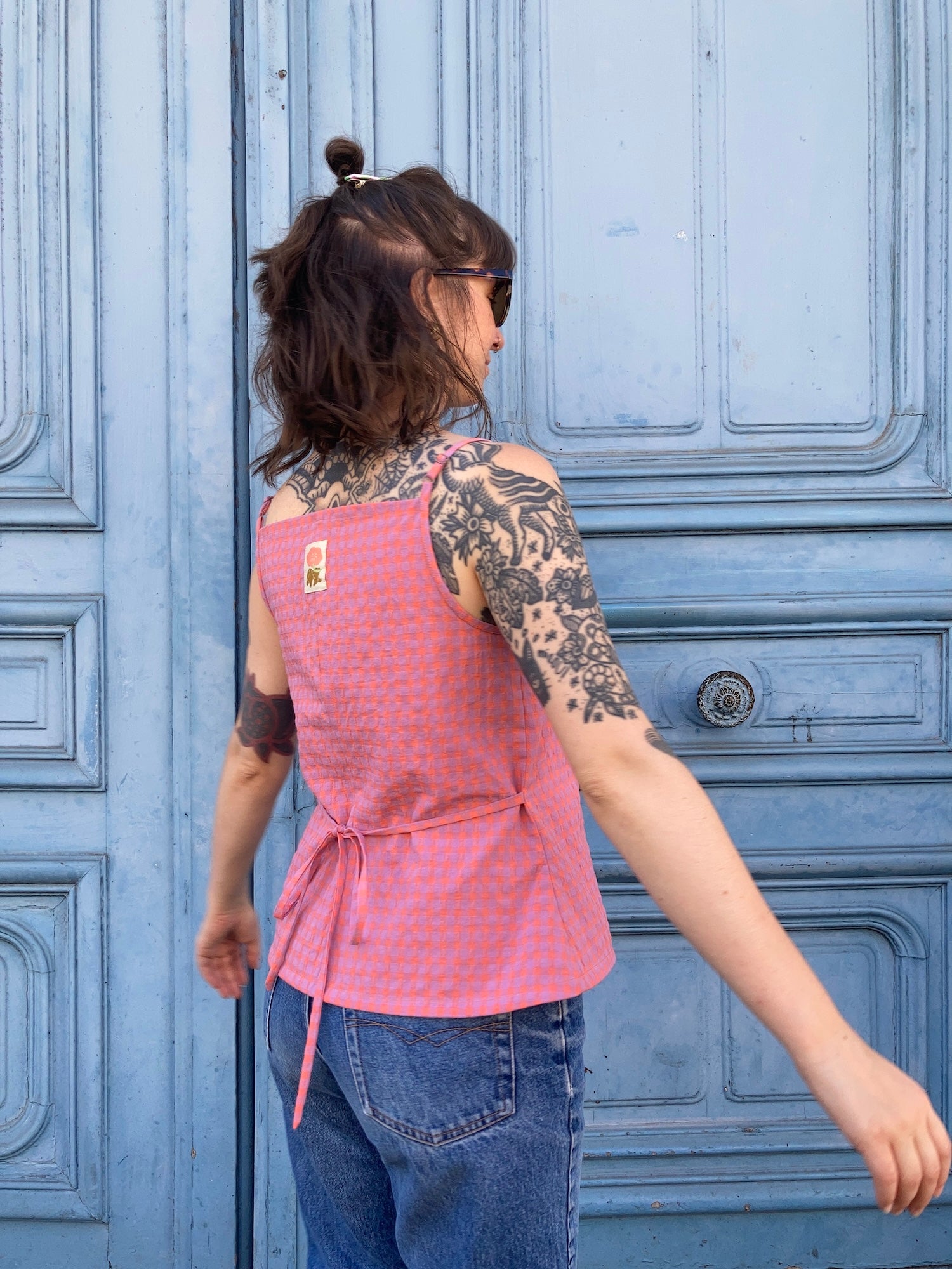 Oni est un débardeur à fines bretelles réglables, deux largeurs proposées, et à encolure droite, sur le devant et le dos. Il s’ouvre sur le devant par une boutonnière et présente un bas légèrement arrondi. Des pinces viennent souligner la poitrine. La taille est mise en valeur par des découpes et par des liens insérés dans les coutures côtés, à nouer dans le dos.