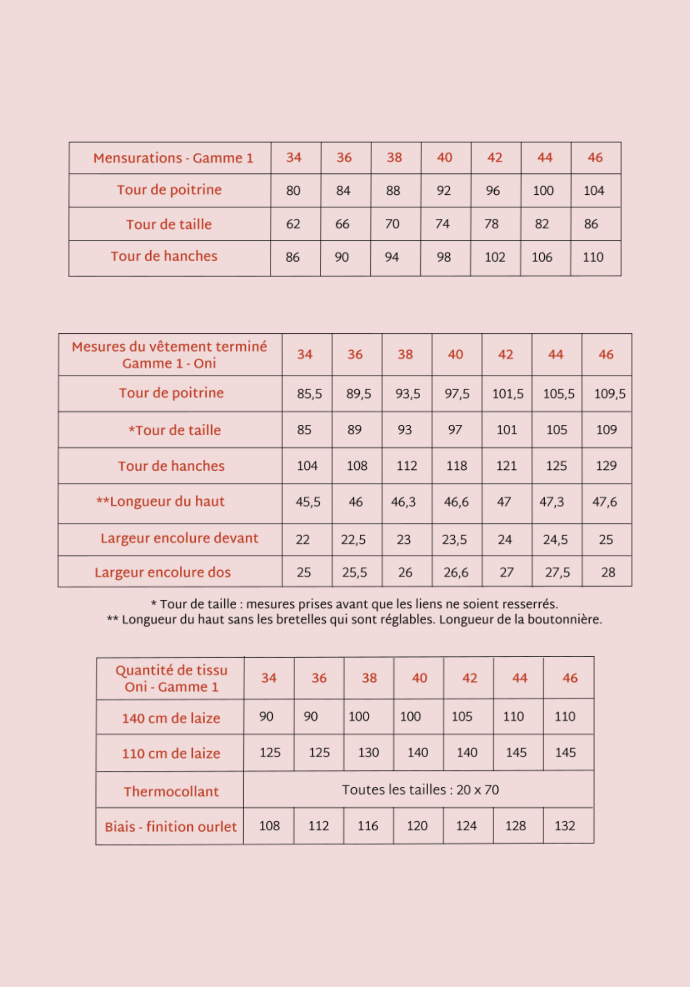 Pour la gamme 1, de la taille 34 à 46 :