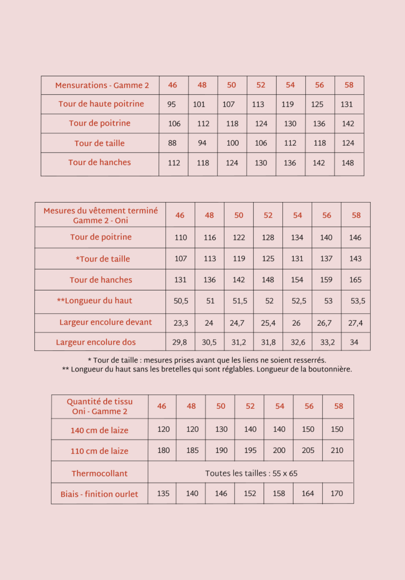 Pour la gamme 2, de la taille 46 à 58 :
